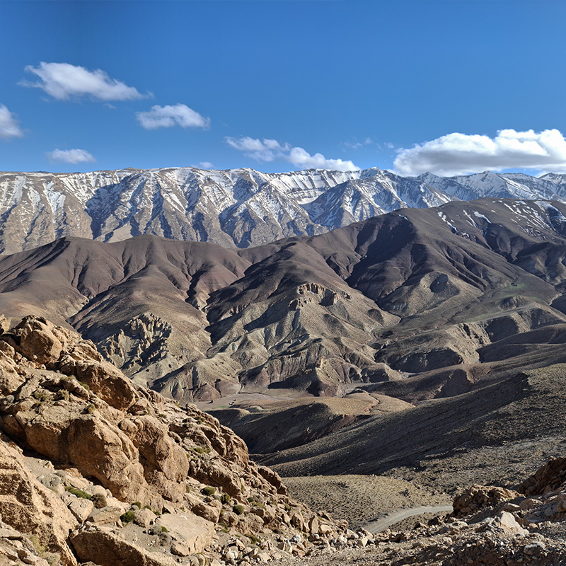 Il giorno dopo lasciamo il caos della città alle spalle e iniziamo a salire. All’inizio è asfalto, poi le curve si stringono e la quota cresce. Al Col de Tizi N’Aït Hmed (3.000 metri) ci sorprende qualche chiazza di neve. Non muri bianchi, ma abbastanza da ricordarci quanto il clima qui possa cambiare in fretta.